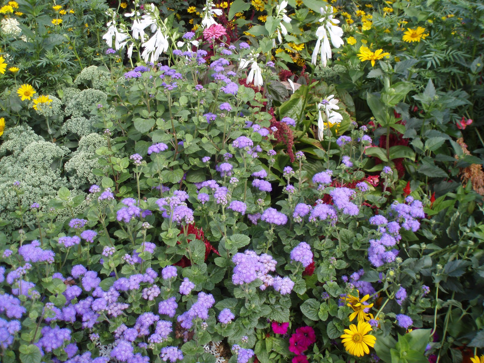 Dan also uses a lot of these blue "Hightide" ageratum, below, also purchased as bedding plants.