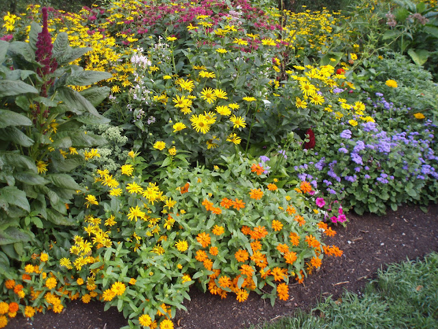 The bright orange zinnias, below, are from the profusion series, a favorite of Dan's, which he buys as bedding plants, not seeds.