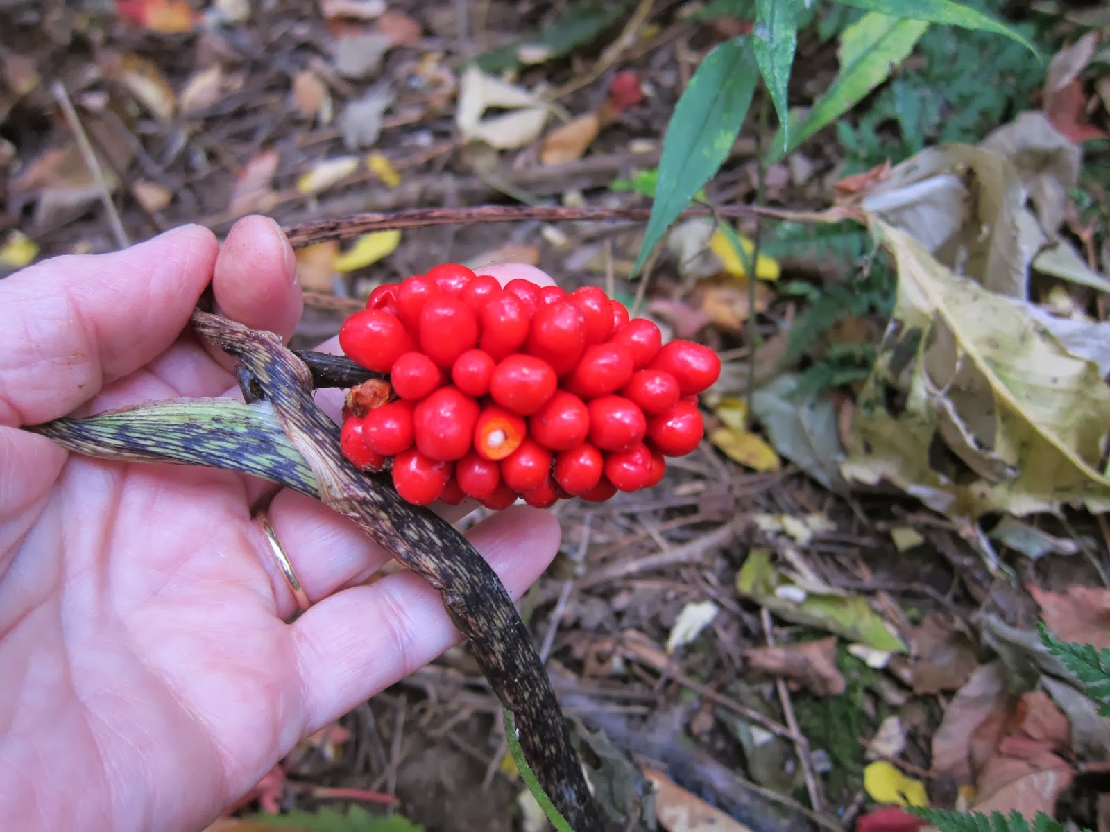 On our return walk, I spotted the bright berries of a fallen-over Jack-in-the-pulpit. Its snake-like stem was too weak at this point to hold up its large cluster of mature fruits.